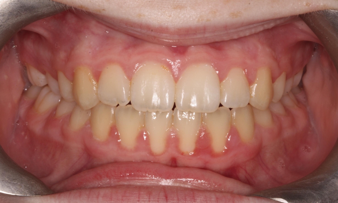This patient had a narrow upper jaw which was expanded using an RME appliance and fixed appliances to align and level the arches. Total treatment time was 34 months